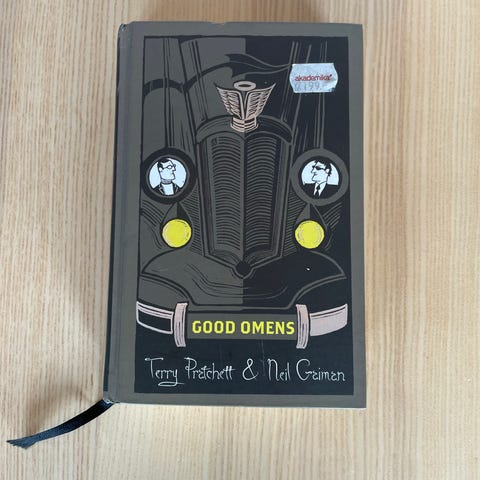 Neil Gaiman & Terry Pratchett - Good Omens. Boken er på engelsk og har standard pocketstørrelse. Passer for lesere interessert i fantasy og satirisk litteratur. Omslaget er litt misfarget bak, men er i helt ok stand. Kan hentes på Majorstua/bislett eller sendes