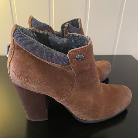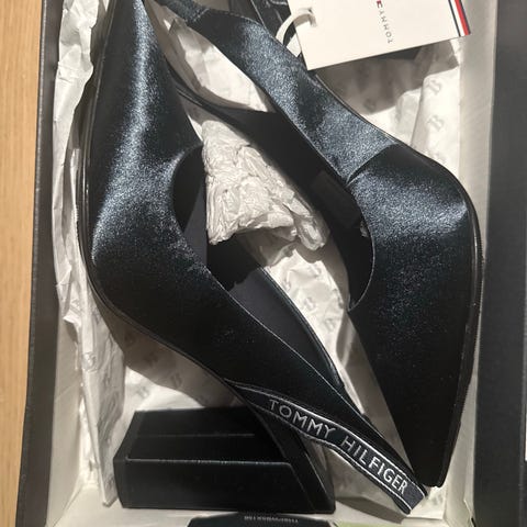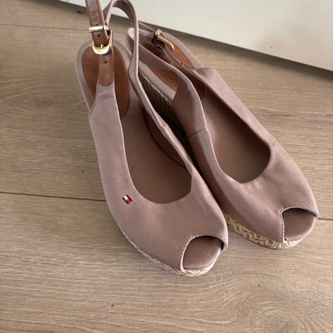 Tommy Hilfiger hæler i størrelse 38, brun farge. Materialet ser ut til å være tekstil med en kilehæl som har flettet dekor. Skoene har åpen tå og ankelrem med spenne for justering.