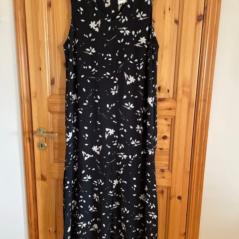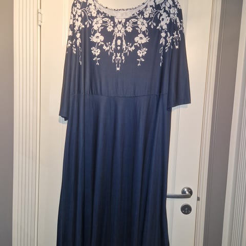 Atelier Christiane kjole i størrelse XL, mørkeblå med hvite blomster. Ermeløs design,