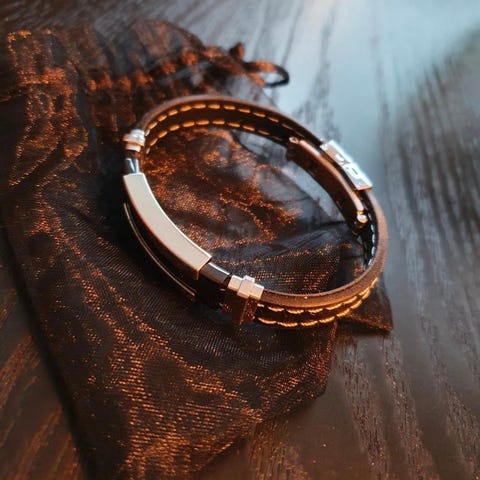 Armbånd med flettet svart lær, stålkomponenter og karbonfiberdetaljer. Passer som tilbehør for både menn og kvinner. Designet med en solid lås for sikker bruk.