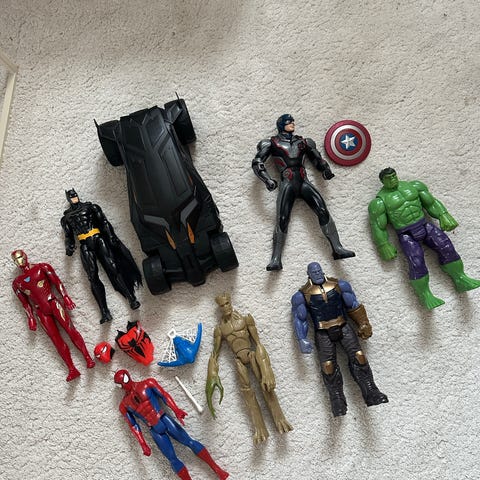 Selger Batman og batman bil, spidey fly samt flere action figurer samlet for 500kr.