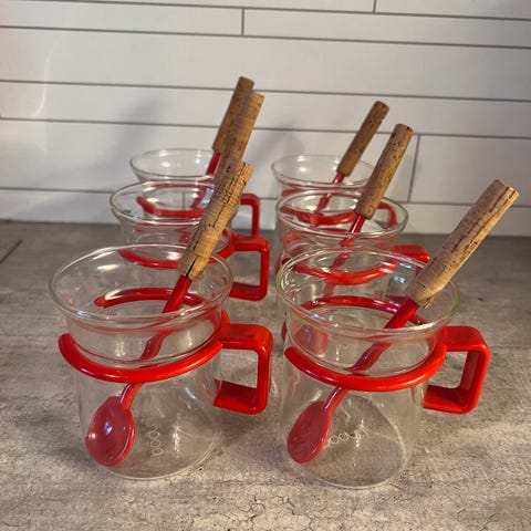 18 kopper med hank og skje, og tekanne , alt fra Bodum. Med brikker. Noe av korken på skjeen er slitt, men finnes på alle. Samlet 700. Kan også hentes Oslo dagtid man/ons/fredag