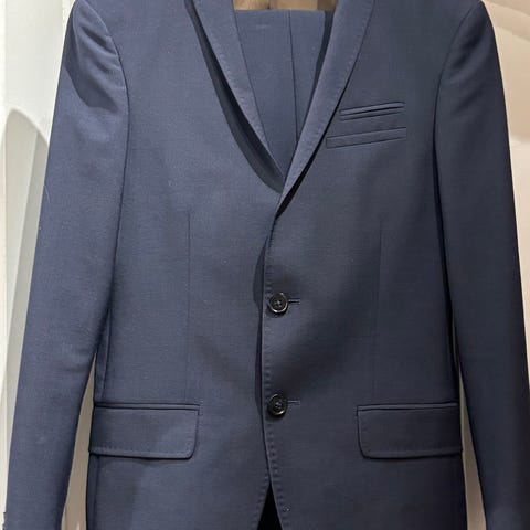 Dressjakke str 40 short og dressbukse 27/30 fra Dressmann . Brukt av ungdom. Pent brukt og fortsatt en pen dress å se på, men med anmerkning, se bilde. En rens er nok derfor nødvendig før bruk.
