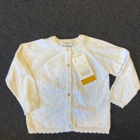 Helt ny genser til jente med broderte blomster, flettemønster og knapper i halsen. Hust & Claire, str. 86.