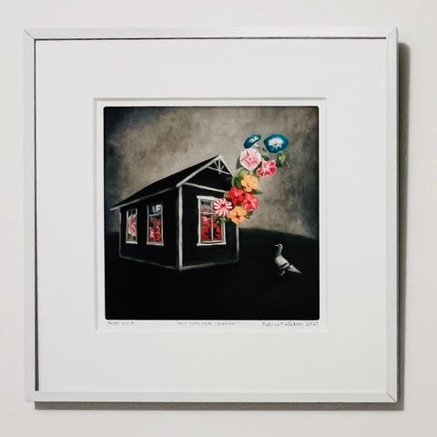 42,5 cm høyt, 32,5 cm bredt, 1,5 cm tykt. Glass i rammen som er dekorativ i seg selv. Må hentes.