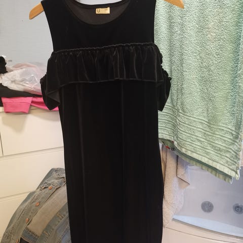 Kjempefin kjole i velurstoff. Den har fine detaljer på armene på skuldrene. Utrolig fin på! Passer fint utover høsten og vinteren!