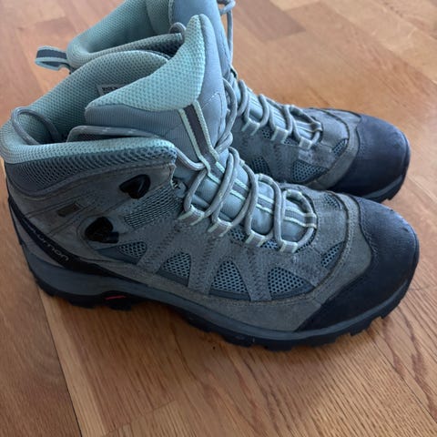 Salomon fotturstøvler i størrelse 38 2/3, med grå og turkis farge. Støvlene er designet for fotturer og har solid yttersåle for godt grep. Materialet kombinerer tekstil og syntetiske deler for holdbarhet og komfort. Lettere brukt.