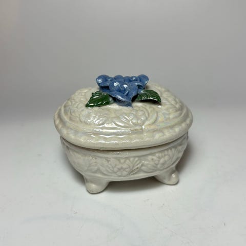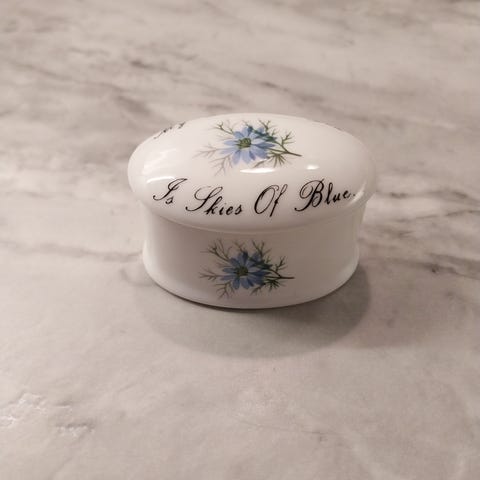 Nydelig lite smykkeskrin/trinketbox, til f.eks. ringer, i porselen, bone china, dekorert med roser, fra Royal Adderley, England, selges for kr 150,-.
