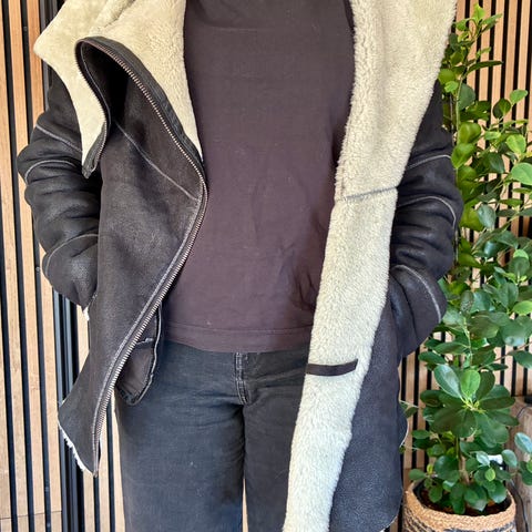 Shearling jakke som ser helt ny ut . Lomme på innersiden trenger noe sting og klespopper . Sauskinn har ingen merker .