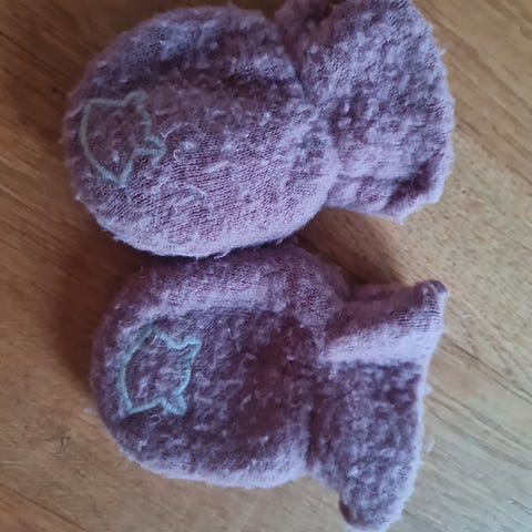 Varme votter i ullfleece uten tommel til baby. Passer ca 0-6mnd. Sitter godt. Nupper slik ullfleece har.
