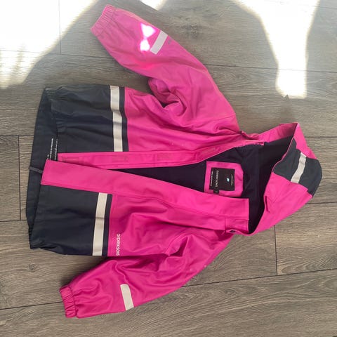 Regn sett med fleece. Pent brukt. Lite synlig flekk på sete (se bilde). Str 120.