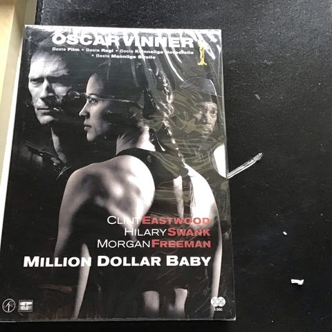 Million Dollar Baby DVD film drama featuring Clint Eastwood, Hilary Swank, and Morgan Freeman. The DVD is a physical media format containing the full-length movie.