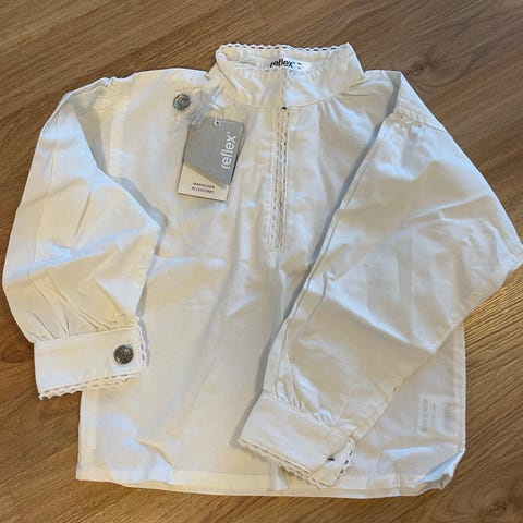 Ubrukt bunadsskjorte i str. 92 selges for 100 kroner. Rakk aldri å bli tatt i bruk før den var for liten. Lappen er fortsatt på, kun prøvd på.