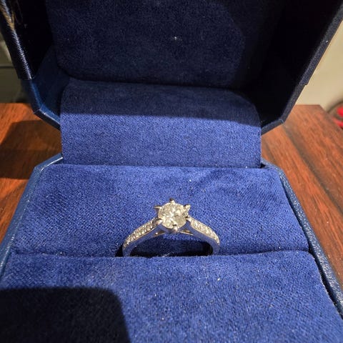 Ringen er lite brukt og oppbevart i ringeske fra gullsmed.
