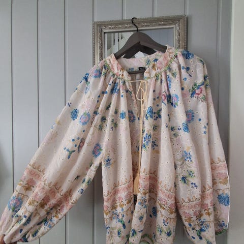 Fin bluse fra Shein med store puffermer og brodert sommerfugl på kragen