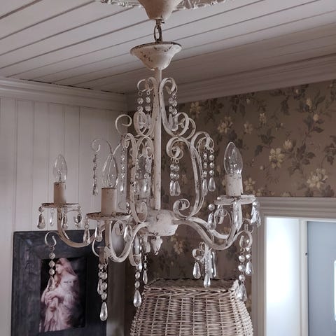 Selger denne flotte taklampen med rosa prismer, som passer perfekt inn på ett jenterom.