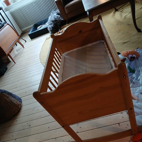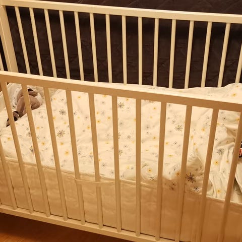 IKEA barneseng laget av hvitt tre. Passer for små barn og har en enkel, åpen design med rette spiler. Kan brukes både innendørs og på balkong, gir en trygg soveplass for barnet.