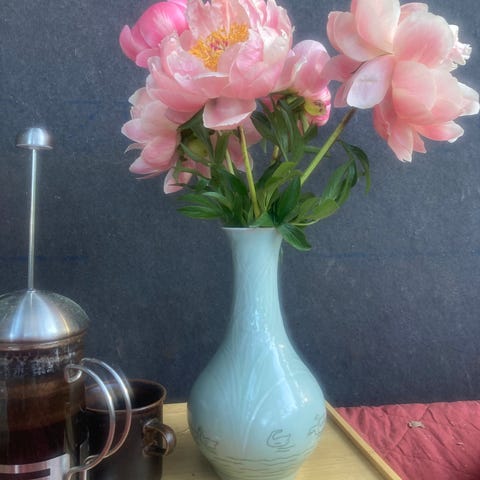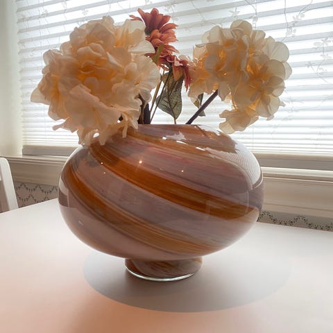 Rosa keramisk vase med dekorativt svart mønster. Vasen har en bred åpning og rund form, egnet for blomsterdekorasjon eller som dekorativt element i hjemmet.