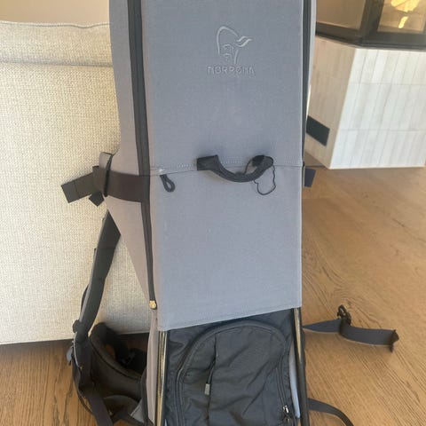 Selger en lite brukt Norrøna Integral barnemeis med stålramme som gjør at den står støtt på flatt underlag, har løftestropper foran og bak.