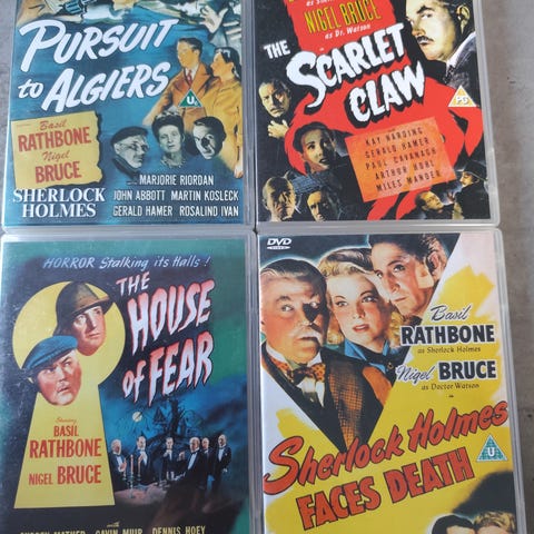 Krim serie med Basil Rathbone - Norsk tekst. 8 filmer på 4 disc , nærmere 550 min. Selges for kr 245 + porto. Evt med fiks ferdig. Se gjerne andre annonser