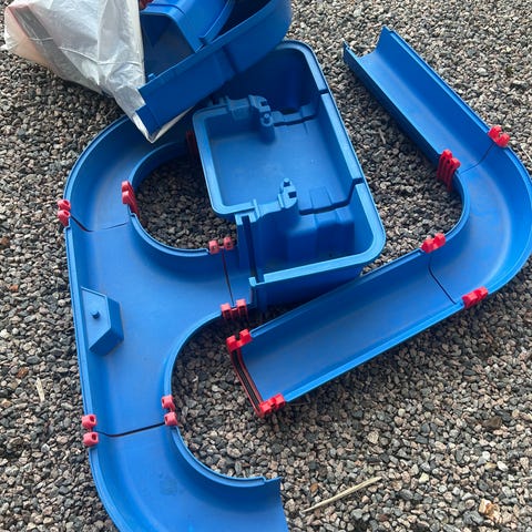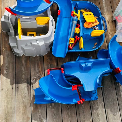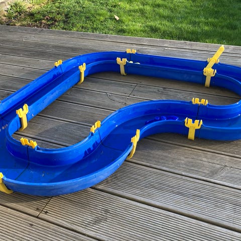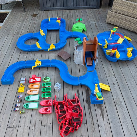 Aquaplay vannleke sett i blå plast med flere deler som kan settes sammen for å lage et vannlekesystem. Inkluderer kanaler, sluser, broer og små båter. Passer for barn og er designet for lek med vann, utvikling av motoriske ferdigheter og kreativ lek.