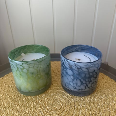 2 telysholdere i nydelig blått mønstrete glass - i perfekt stand.