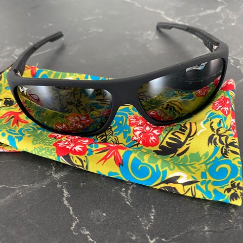 Maui Jim Dame solbriller med svart innfatning og mørke glass. Solbrillene leveres med etui og mykt etui for oppbevaring.
