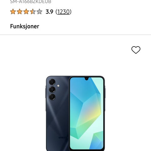 Samsung Galaxy A16 5G mobiltelefon med 128 GB lagringskapasitet. Enheten har svart farge og støtter 5G-nettverk. Modellen tilhører Galaxy A-serien og er designet for generell bruk.