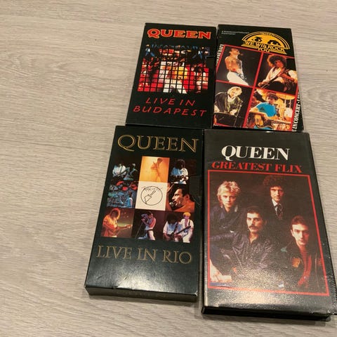 Queen We Will Rock You Live In Concert VHS tape. Inneholder liveopptak av Queen med låter som "We Will Rock You", "Let Me Entertain You", og flere. Fargemateriale, stereo lyd. Passer til VHS-spillere.