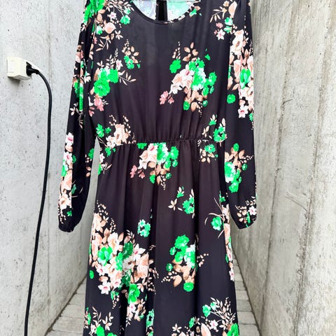 Floyd kjole i flerfarget mønster, størrelse XL. Kjolen har lange ermer og en elastisk, rynket overdel med et løst og ledig snitt i skjørtet.