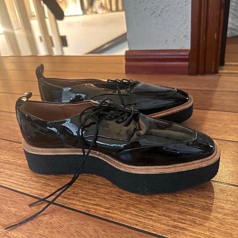 Zara pensko i størrelse 40 laget av svart lakkskinn. Skoene har snøring og en tykk såle med kontrasterende brun og svart farge. Egnet for formelle eller semi-formelle anledninger.