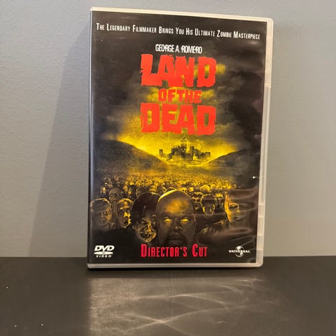 George A. Romero Land of the Dead DVD. Film med zombietema, inkludert DVD-plate og original cover. Produktet er i standard DVD-størrelse og leveres i plastomslag med baksideinformasjon og bilder fra filmen.