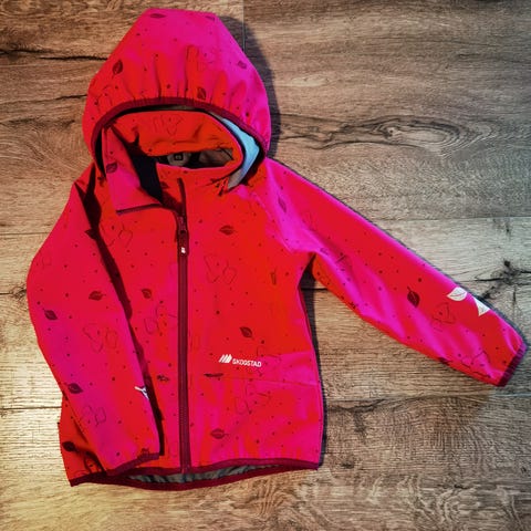 Skogstad barnejakke i størrelse 110 for jenter. Jakken er rosa og laget med et mykt fleecefôr på innsiden. Den har hette, glidelås foran, og borrelåslukking på ermene for justering. Jakken er designet for å gi komfort og beskyttelse mot vær og vind.