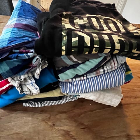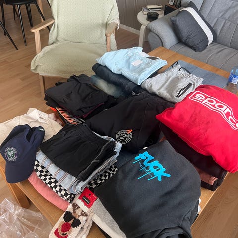 Noen av klærne er ubetydelig brukt. Andre er ok, ingen synlige hull, vanlig bruksslitasje