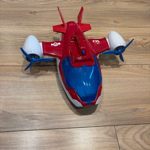 Paw Patrol Red Rescue Helicopter lekefly i rød med blå vindu og propeller. Inkluderer en liten figur. Egnet for barn, laget i plastmateriale, designet for lek og rollelek.