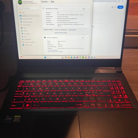 Selger min bærbare PC, MSI Katana GF66. Kjøpt hos Elkjøp. Den er oppgradert med 32 GB RAM og en ekstra 2 TB SSD-lagringsdisk.