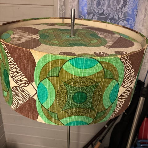 Brunbeiset tidstypisk stålampe. Designet slutten av 60 tallet. Delikat lysutkast, og detaljrik design. Noen små flekker og et rift i skjerm. Høyde va 162. Ujordet