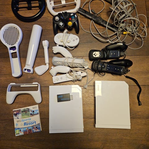 Nintendo Wii spillkonsoll inkludert kontrollere, ladekabel og annet tilbehør. Konsollen er hvit og har standard tilkoblinger for spill og strøm. Noe slitasje og skader på kabler er synlig, som kan påvirke funksjonaliteten.
