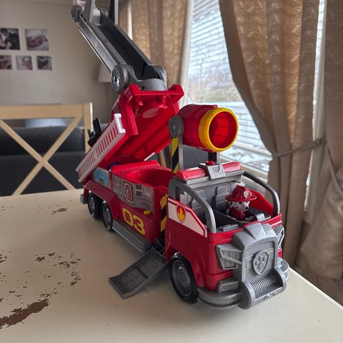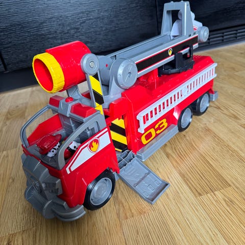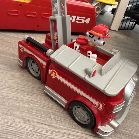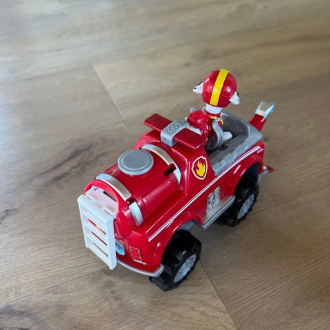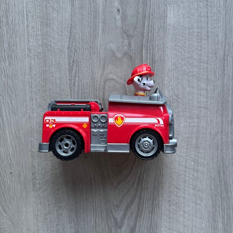 Paw Patrol brannbil lekebil i rødt plastmateriale. Inkluderer marshall og en hydrant. Egnet for barn og lek.
