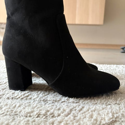 Nude skinn ankelstøvletter i svart farge, designet for damer. Støvlettene har en høy hæl og glidelås på innsiden for enkel påkledning. Detaljer inkluderer en dekorativ lenke rundt ankelen. Egnet for bruk i ulike anledninger som krever et stilrent og formelt utseende.