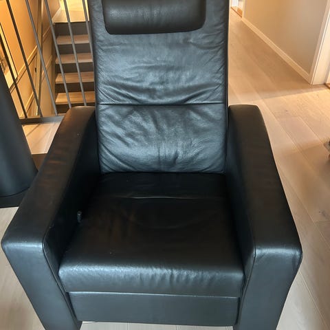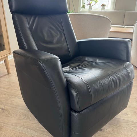 Skinn lenestol med elektronisk tilkobling for lading av usb og elektrisk utfellbar puff. Vi har 2 like, men mannen vil helst ikke selge så det er i utgangspunktet den ene 😂 Utrolig god, favorittstol foran tv. Kostet 20 000 nye så prisen er satt, ingen pruting.