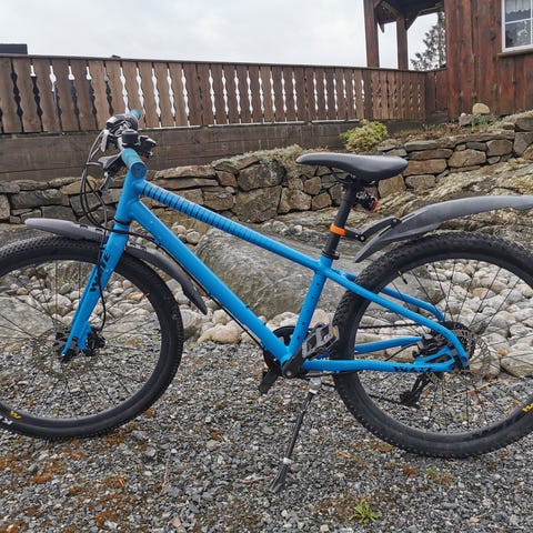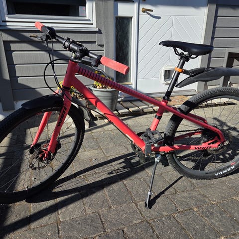 Merida Terrengsykkel i rød og svart farge. Meget lett og robust aluminiumsramme og med dekk tilpasset variert underlag. Merida Lite alu-gaffel. Påmontert justerbar styrebro(stem). Shimano Altus 8 gir, Tektro hydrauliske skivebremser. MTB skjermer påmontert. Parkert for det meste i garasje. Passer 9-14 år avh. av str.