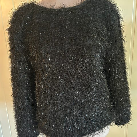ONLY Blue Behaviour grå genser i størrelse M, Genseren har en myk, lodden tekstur med dekorative svarte pynteperler rundt halsen. 65% nylon og 35% akryl. Hentes eller sendes mot frakt.