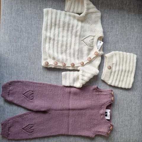 Pent brukt strikket sett. Antyding til noe misfarging på det hvite bak, se eget bilde. Eller ingen anmerkninger og settet er lite brukt.