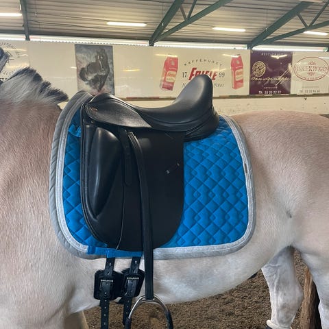 Pent brukt Kent & Masters dressur sal str 33/17 tilslags. Utskiftbar bom. Følger med 1 stk bom i grønn.
