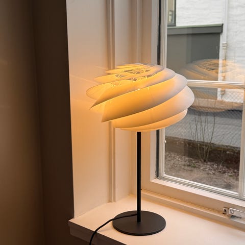 Swirl 3 fra Le Klint er designet av Øivind Slaatto. Lampen har klare referanser til Le Klints klassiske design, samtidig som den har sitt eget formspråk. Lamellene på lampen fordeler lyset godt i rommet, slik at lampen fungerer like godt som brukslys og en estetisk lyskilde.