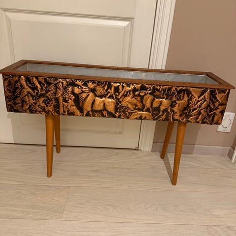 Dekorativ blomsterkasse kledd i banket/stanset kobber. Vakkert håndverk. Spennende motiver på sidene; flotte dyre- og landskapsdetaljer som gir et unikt og nostalgisk uttrykk (se vedlagte bilder).