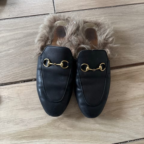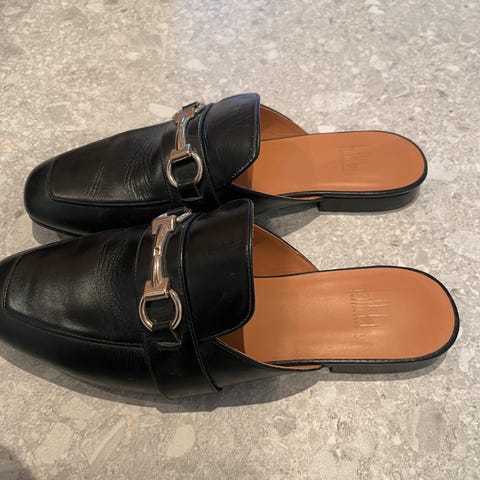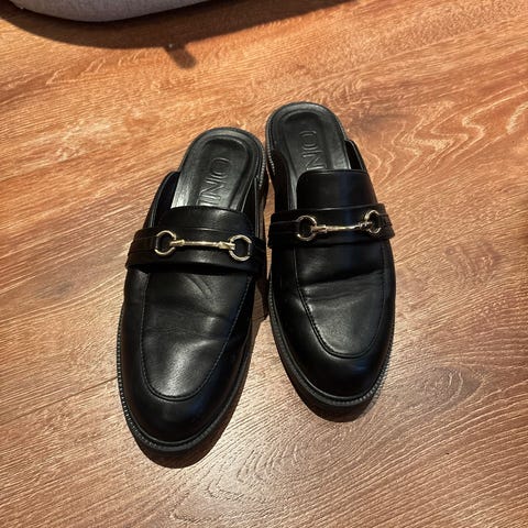 Pent brukte svarte skinn-mokkasiner. 100% skinn og usikker på hva slags for det er inni, men myke, lekre og komfortable.
