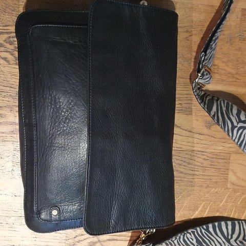 Ekte lær og veldig god kvalitet veske. Har en liten ripe som kan repareres med skokrem. Lite brukt.