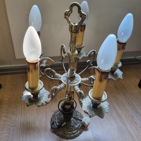 Vakker lysekrone, porselen/ messing selges høystbydene over 500,-